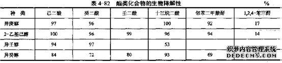 合成飽和酯的生物降解性與其化學結構有很大關系。S.J.Kandles對不同結構的酯類化合物的生物降解性進行了研究,結果見表4-82??梢钥闯?,由同種酸和不同鏈長的異構醇反應生成的酯類化合物,生物降解性隨支鏈醇相對分子質量的增加而降低。由不同二元酸和同種醇反應生成的酯,其生物降解性不隨酸相對分子質量的增加而變化。在酯類化合物中,引入芳環會減弱生物降解性。總之,線性、非芳環和無支鏈的短鏈分子的生物降解性通常較好。由此看來,用作環境友好潤滑油基礎油的合成酯一般是雙酯、多元醇酯、復合酯和混合酯。